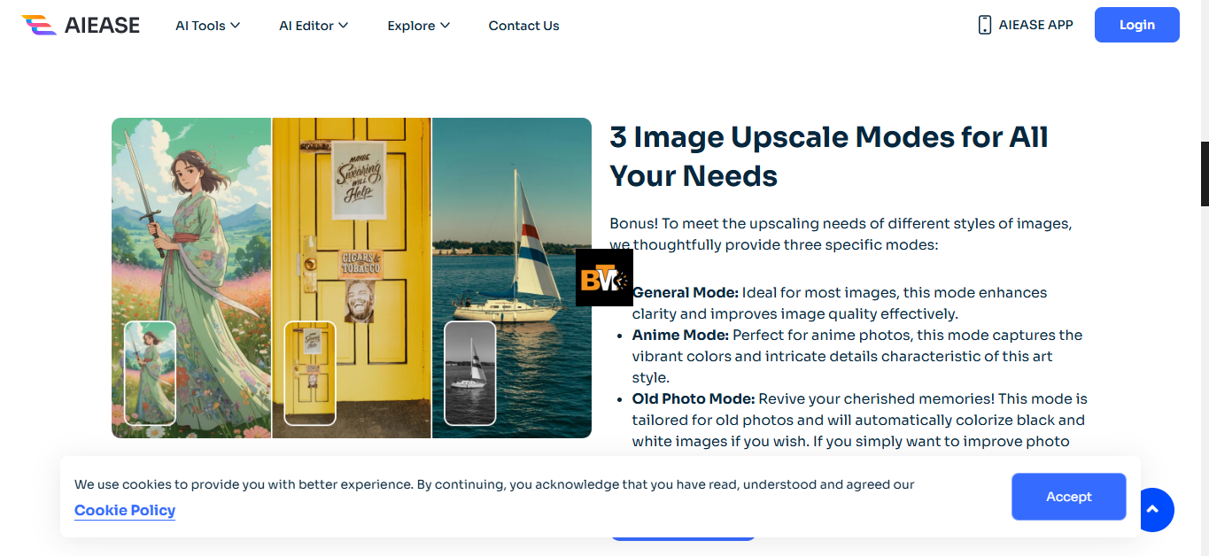 AI Ease’s most amazing feature is its several upscaling modes, which can be set for various types of images. General Mode is for normal photos, Anime Mode is for digital art, and Old Photo Mode is for fixing old photos. It also provides 2× and 4× resolution boosts, letting you upscale images as needed.